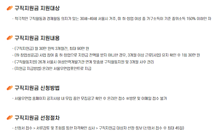 구직지원금 지원대상 적극적인 구직활동과 경제활동 의지가 있는 30세~49세 서울시 거주, 미 취·창업 여성 중 가구소득이 기준 중위소득 150% 이하인 자 구직지원금 지원내용 (구직지원금) 월 30만