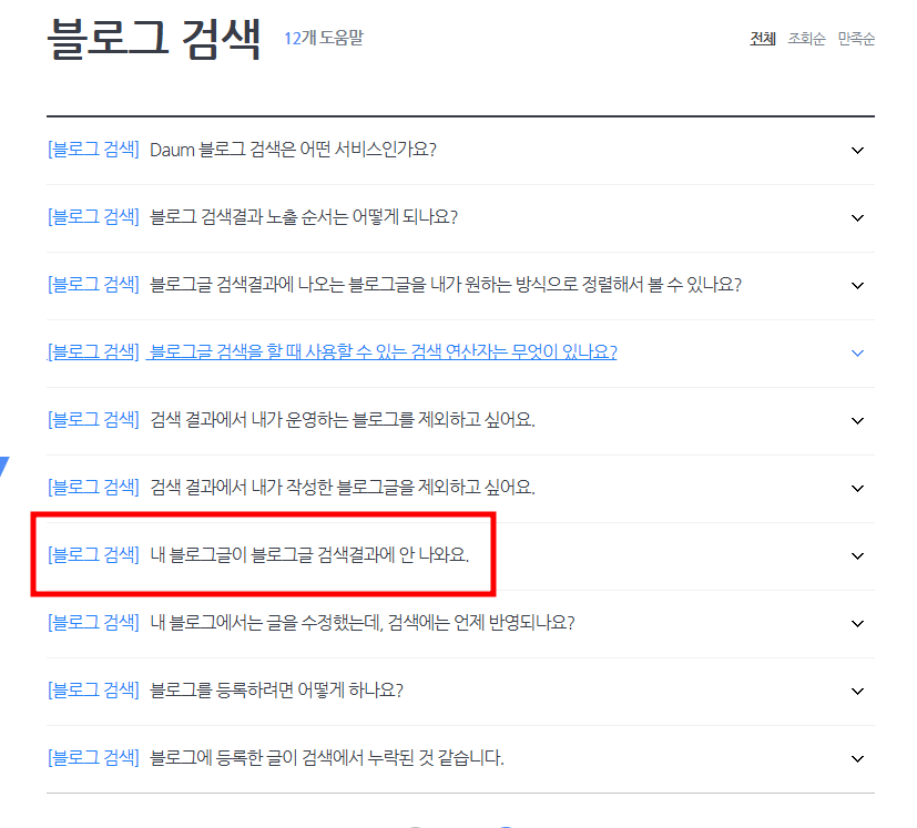 다음 포털 사이트 맨 하단 고객센터 > 검색 > 블로그검색 > 내 블로그글이 블로그글 검색결과에 안 나와요 > 문의하기 바로가기 > 문의분류에서 블로그, 카페 검색 문의를 체크하고 필수항목을 작성한 후 기다리시면 됩니다.